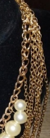 Featuring gold-tone, brass, faux-pearl embellishment, layered design and adjustable chain long collar necklace Closure lobster claw clasp.linked large faux pearls and multiple layers of gold-tone mixed chains. This bold statement piece is designed with a bib-style collar and long cascading chain tassels that create a chandelier or fringe effect.