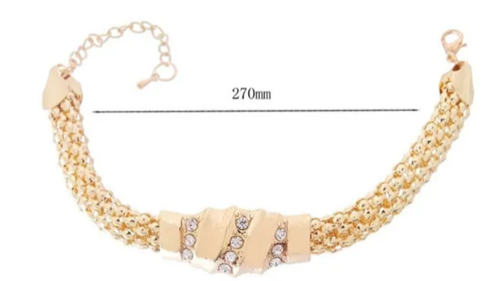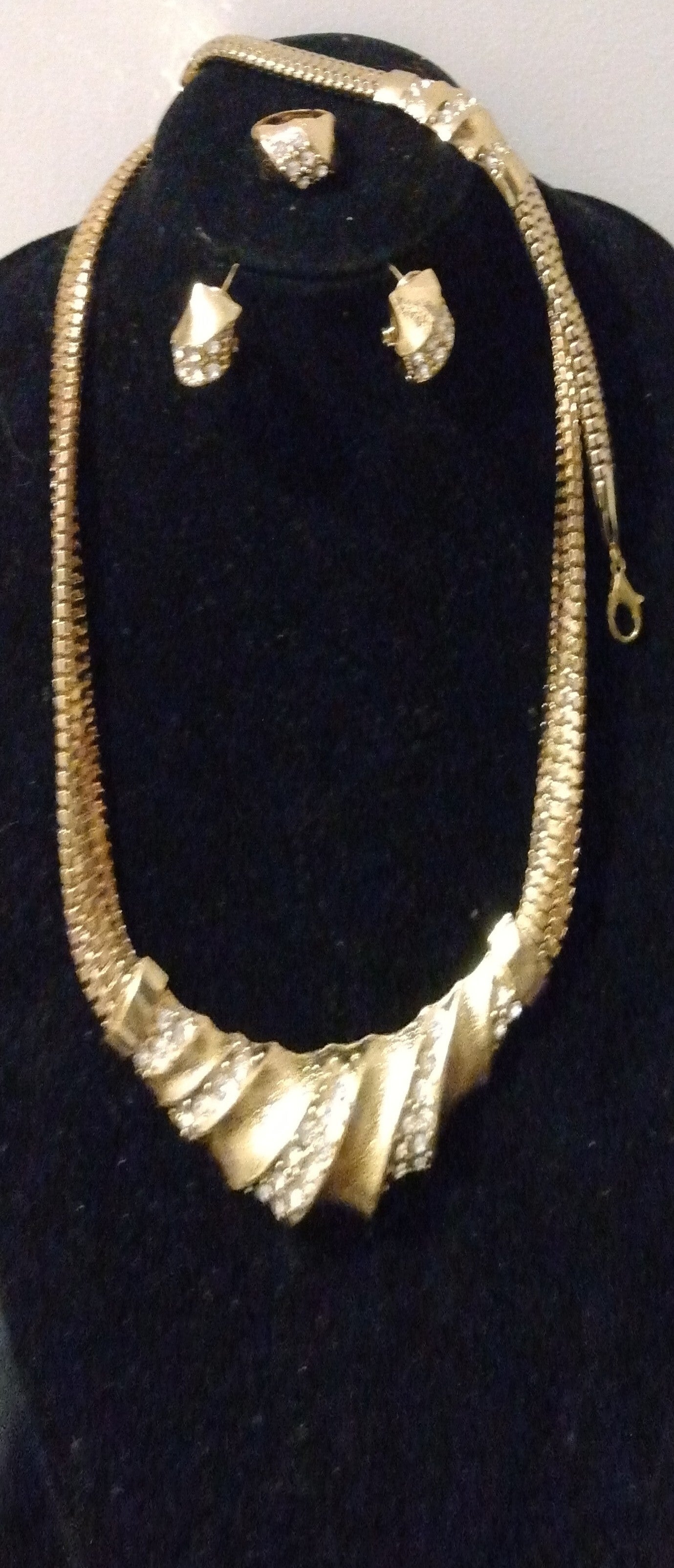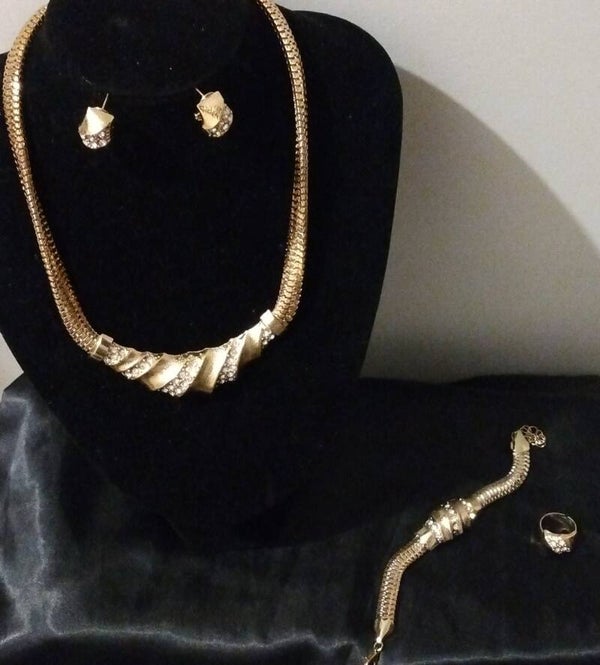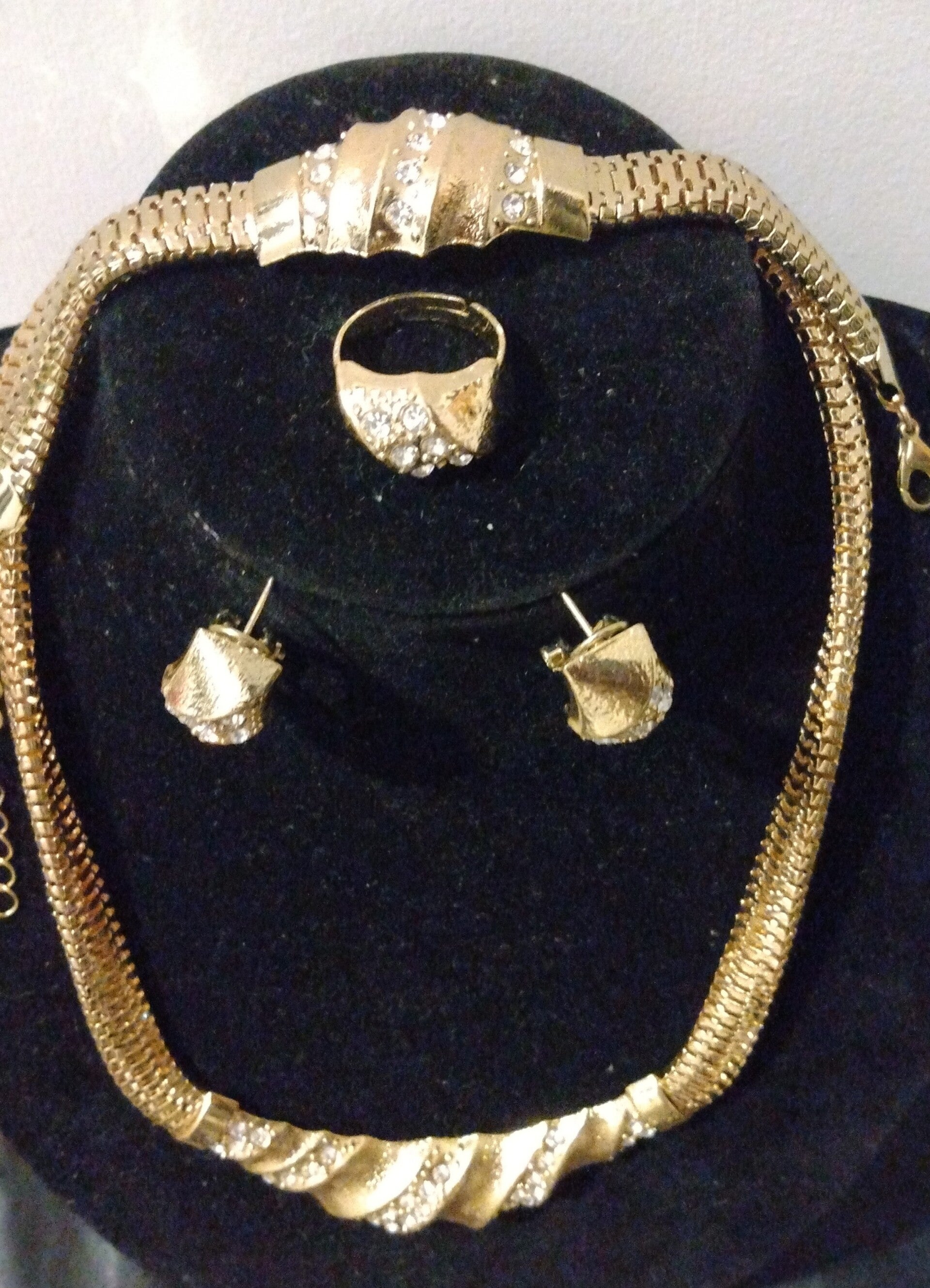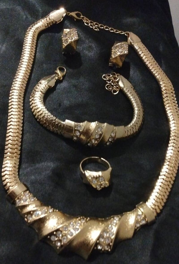 This set of jewellery has been designed with style and elegance in mind.This is a beautiful jewellery with a rose gold bow. It has four separate pieces: a ring, necklace, and earrings, bracelet.