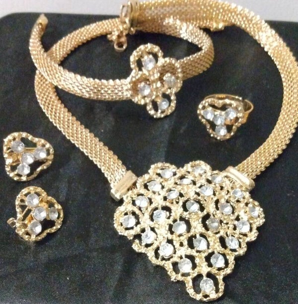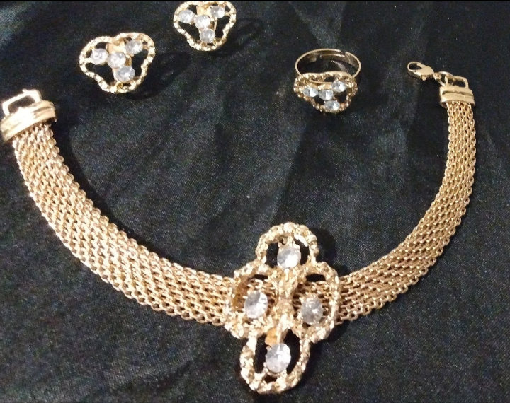 💥Gold Color Crystal Necklace Bangle Earring Ring set. Such a charming and gorgeous set of necklace and earring set. Each piece is unique and fashion. You can surely wear in front