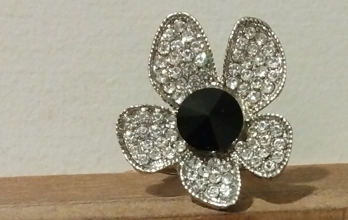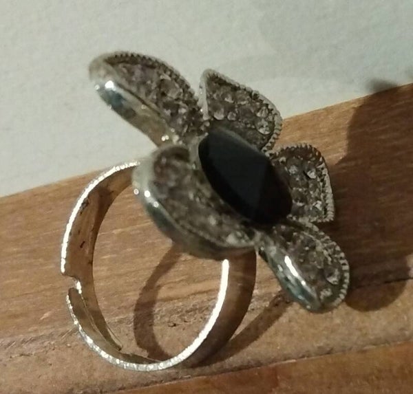 MzSucc3zz Ladies Flower Black Pave Rhinestone Crystal Deco Adjust Silver Ring