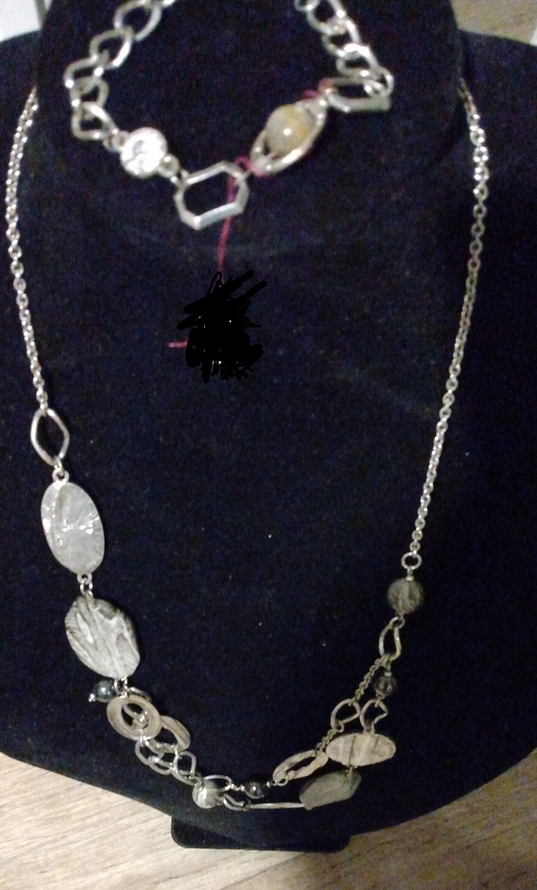 Multi-strand necklace featuring both silver-toned chain and various beads and pendants.