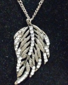 Bohemian vintage-style silver-tone necklace featuring a large feather or leaf-shaped pendant encrusted with sparkling clear rhinestones. The pendant is suspended from a classic silver-toned link chain that includes an adjustable extender and a lobster claw clasp.