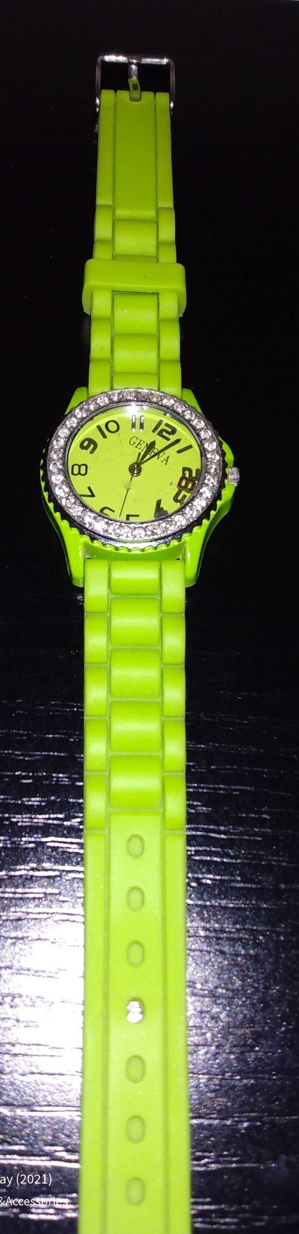 GENEVA GREEN RUBBER WOMENS LADIES CRYSTAL WATCH ANALOG. Great Refurbish condition. Needs new battery. Sold as is.