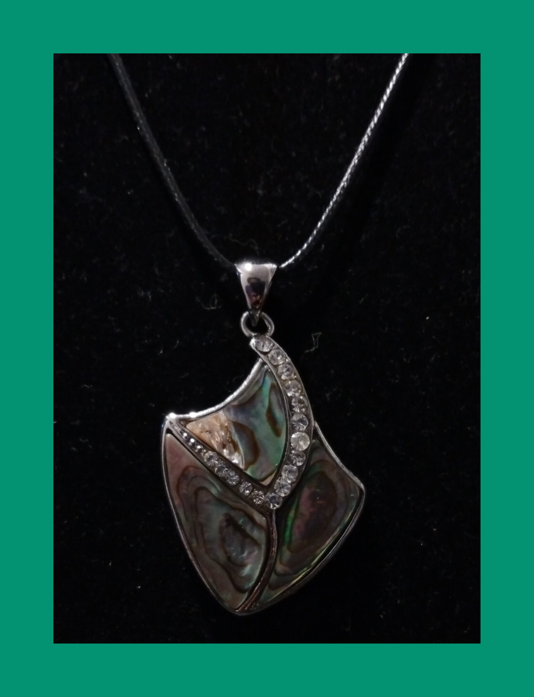 Metal Setting: The abalone pieces and stones are set within a metal frame, which appears to be silver-toned..pendant style can be described as an abalone shell inlay pendant with a rhinestone or crystal accent.