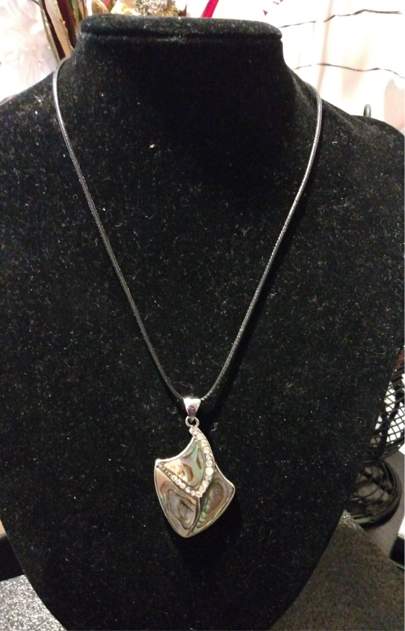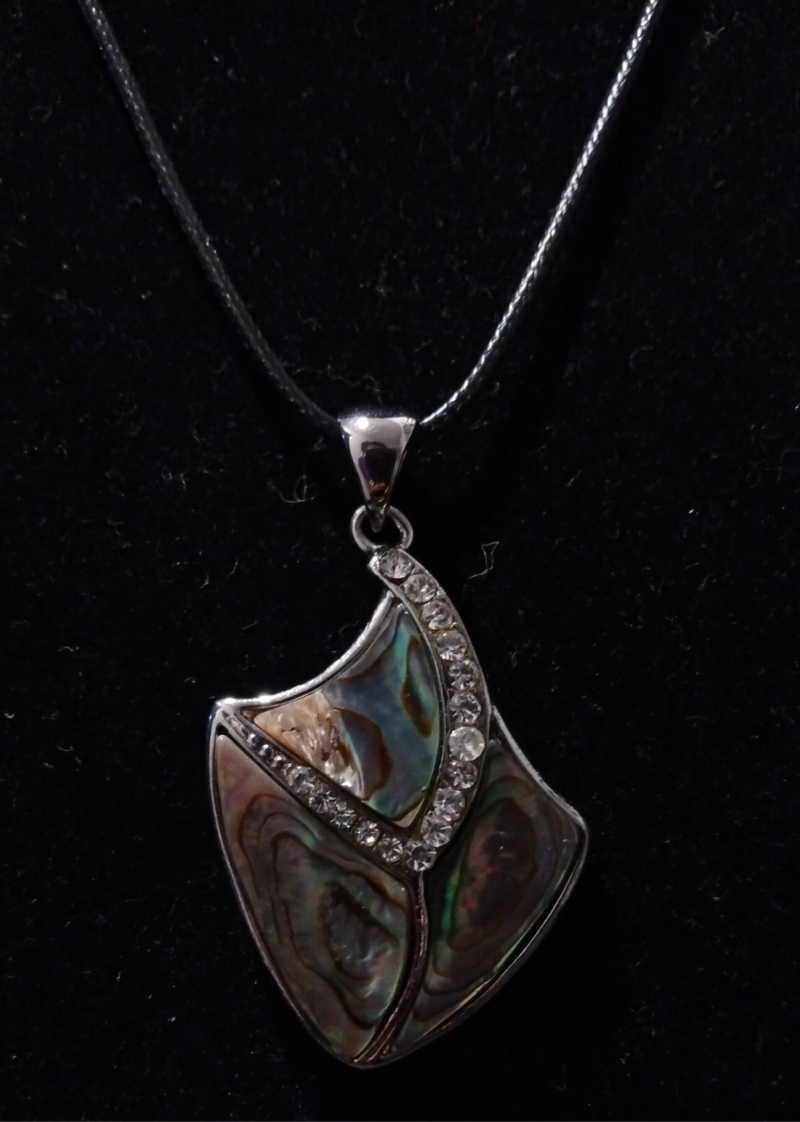 Metal Setting: The abalone pieces and stones are set within a metal frame, which appears to be silver-toned..pendant style can be described as an abalone shell inlay pendant with a rhinestone or crystal accent.