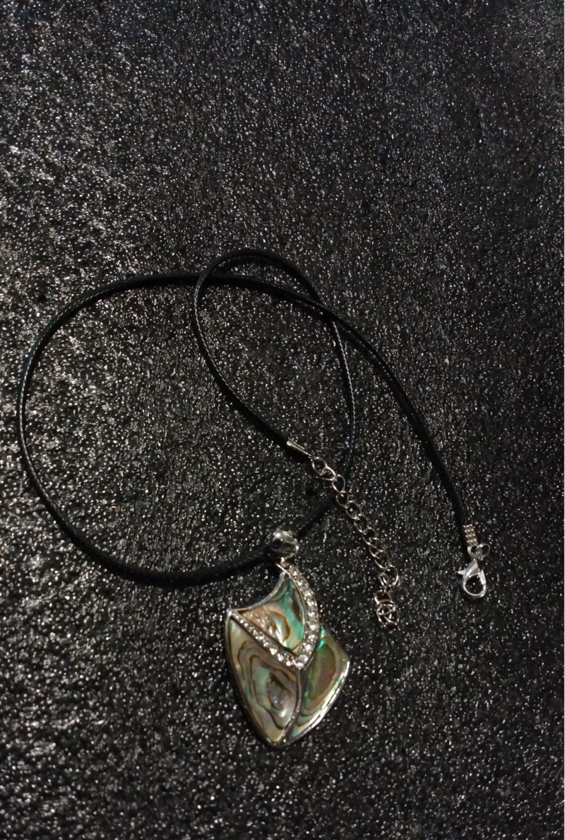 Necklace featuring a pendant made from abalone shell, known for its iridescent, shimmering colors. This particular piece has a distinctive shape and is accented with what appears to be a clear stone or crystal, possibly cubic zirconia or a similar material, adding a touch of sparkle.