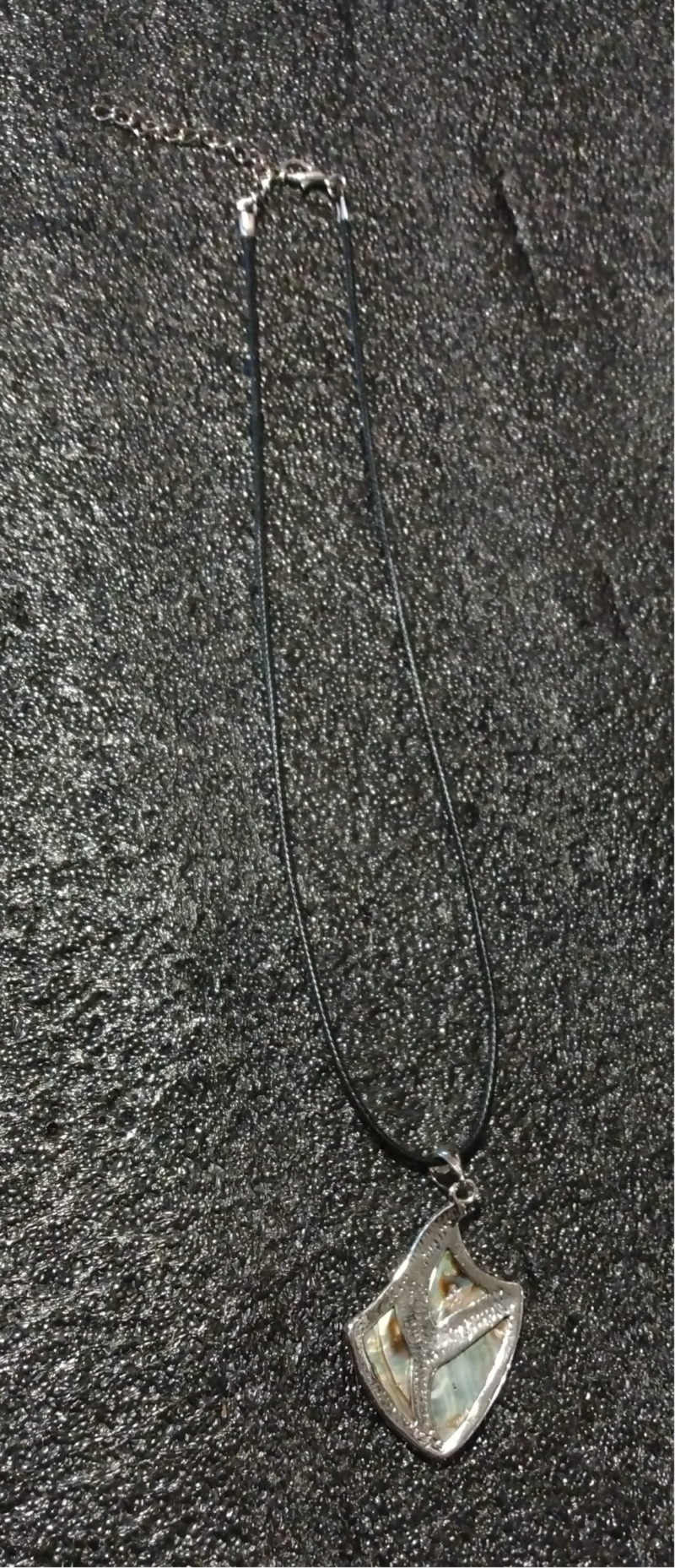 Geometric or Abstract Design: The shape of the pendant and the arrangement of the abalone pieces suggest a modern, possibly abstract or free-form design rather than a traditional or figurative one.