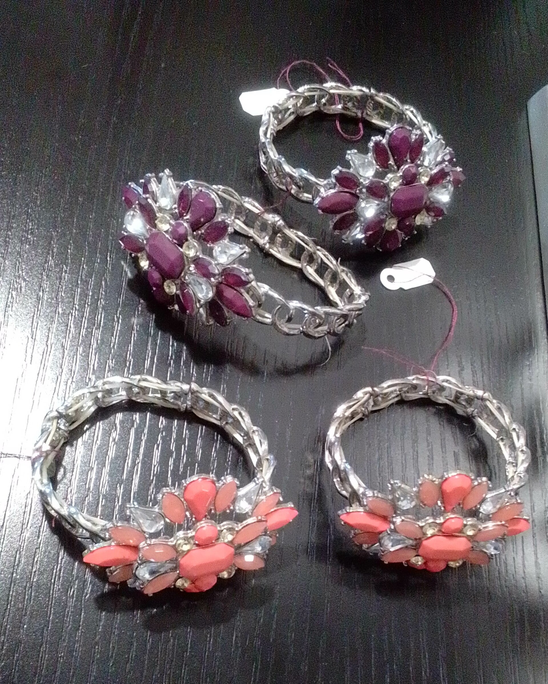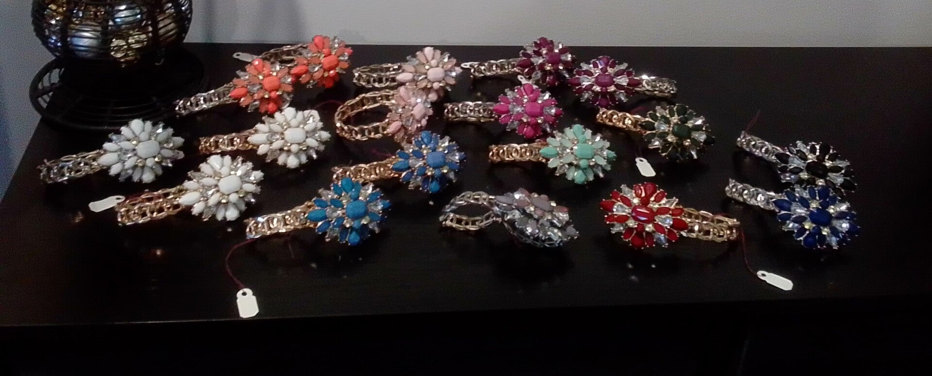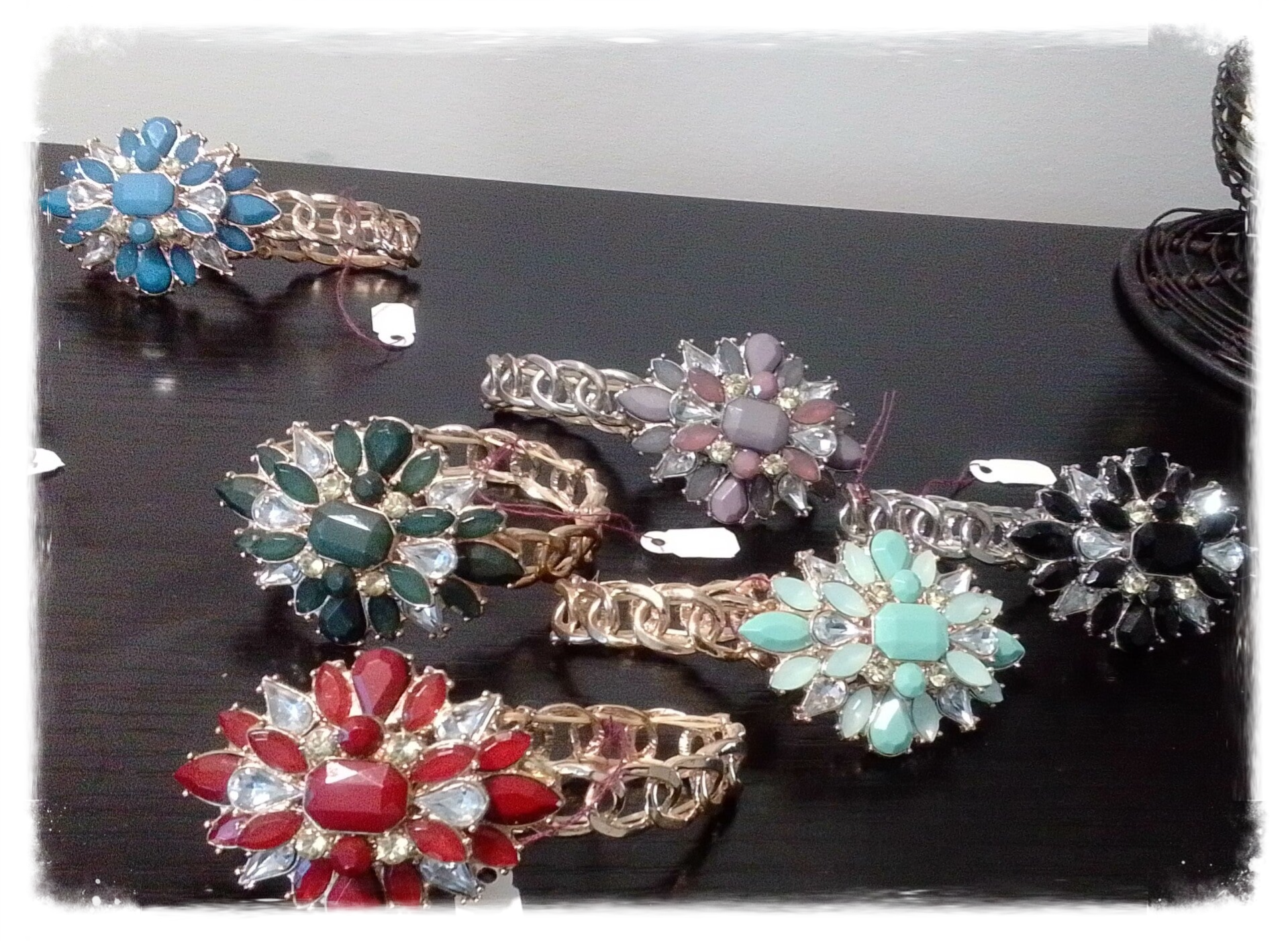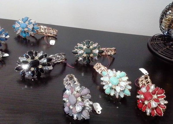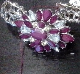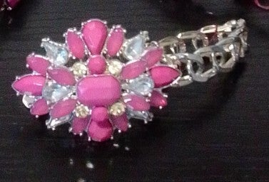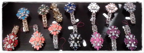 This collection of chunky, colorful floral-themed statement bracelets offers a glamorous, high-impact accessory designed for romantic, evening, or special occasion looks. They are characterized by intricate marquise-cut stone arrangements that evoke natural flower clusters and sunburst patterns.