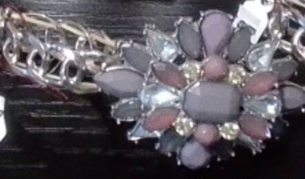 Design: A chunky, geometric floral cluster featuring multi-tiered "petals" of colorful crystals and shimmering rhinestones.