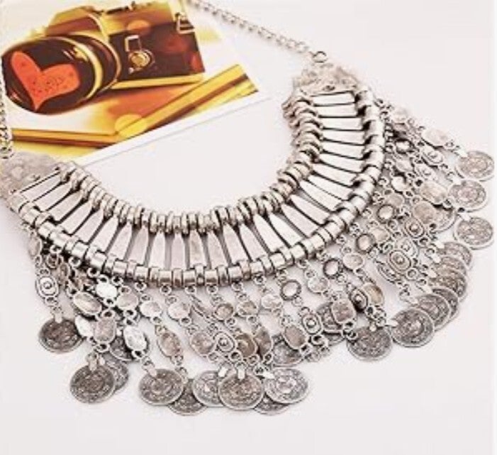 Vintage-style Bohemian Ethnic Tribal Gypsy Boho Coin Chunky Statement Necklace, Gypsy Costume Bib, Festival Jewelry Chandelier Coin Necklace, Boho Long Maxi Coin Necklace. For Women Vintage Ethnic Statement Big Collar Tassel Choker Necklace Femme Silvery Gypsy Jewellery. Long Tassel Chunky Boho Coin Statement Necklace For Women Silver Bohemian Necklaces