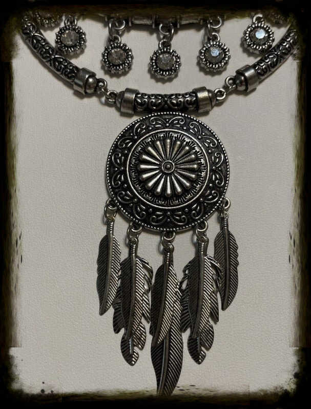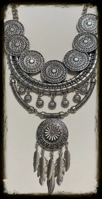 For Female Boho, Gypsy, Tribal, or Native American style. Multi-tiered Silver-toned statement piece featuring a tiered, bohemian-inspired design. It is characterized by multiple circular medallions with intricate etched patterns, a layered bib structure, and a central pendant adorned with hanging feather charms.