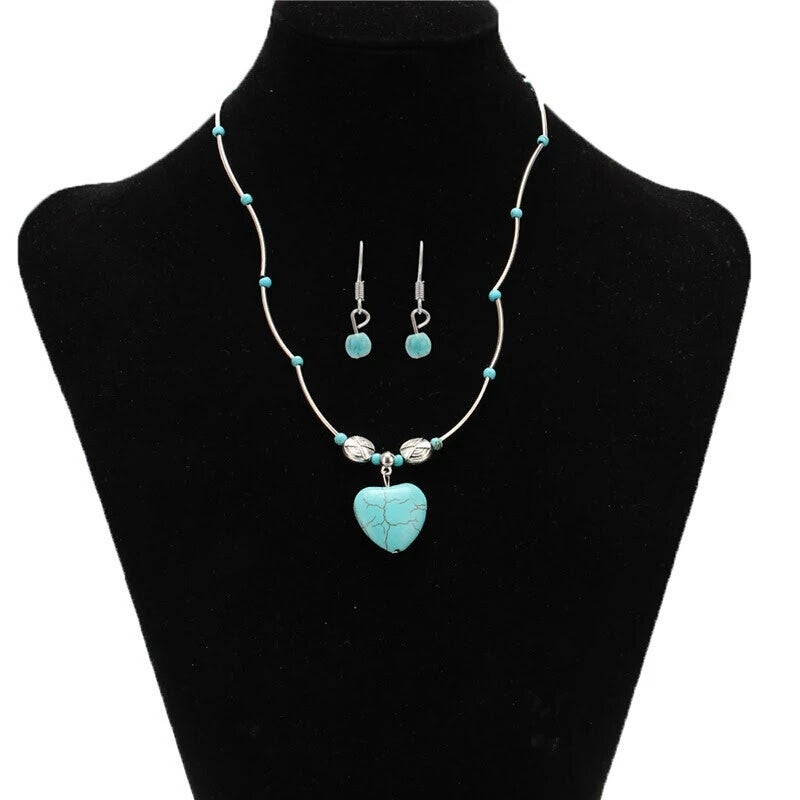 💙Gemstone Beautiful Rectangle, Heart, Tear-Drop, Circle, Shape Pendants + Turquoise Drop Charm Ornate + Turquoise Pendant and Matching Earrings Jewelry Set
