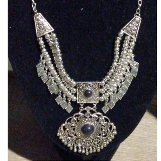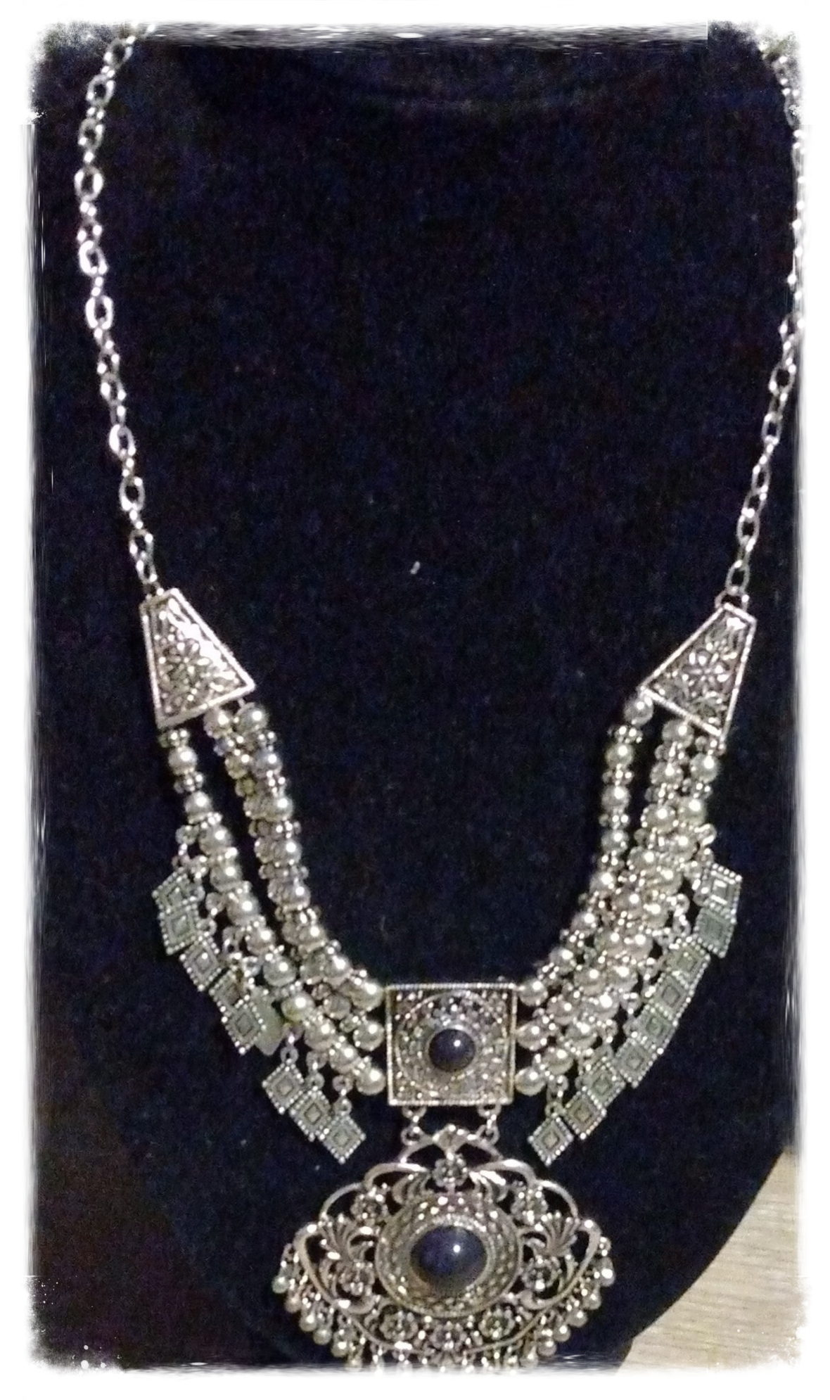 MzSucc3zz Women MzSucc3zz Boho silver-tone Aztec blue bib necklace with ornate fringe details. Bohemian Chunky Blue Bead Stone Tribal Ethnic Fringe Bib Necklace. Tassel silver-tone statement bib necklace. Features a tiered design with multiple beaded strands, ornate filigree work, and central pendants set with blue stones, possibly lapis lazuli or resin necklace